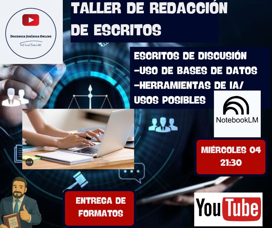 Colegas!!!! Siguiendo con el calendario de clases, hoy tendremos un taller de redacción de escritos judiciales, compartiendo algunas recomendaciones formales a la hora de cumplir con las exigencias legales de demanda y contestación; la construcción de argumentos y el uso de fuentes doctrinales y jurisprudenciales. Además, abordaremos el uso de bases de datos, procesamiento de información y algunas herramientas de inteligencia artificial que nos pueden ayudar a simplificar procesos engorrosos como la organización de gran cantidad de datos!!! (notebook LM entre otras) para así facilitar el trabajo profesional dogmático propio de la abogacía y que por suerte para nuestra carrera, aún no se puede reemplazar!!!!!